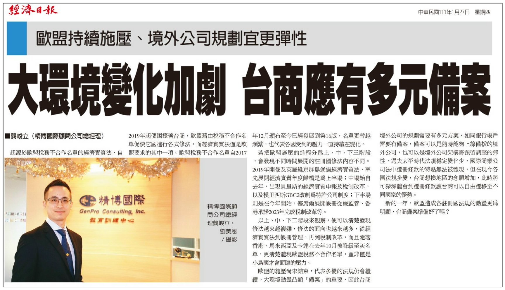 起源於歐盟稅務不合作名單的經濟實質法,自2019年起便困擾著台商,歐盟藉由稅務不合作名單促使它國進行各式修法,而經濟實質法僅是歐盟要求的其中一項。歐盟稅務不合作名單自2017年12月頒布至今已經發展到第16版,名單更替越頻繁,也代表各國受到的壓力一直持續在變化。 若把歐盟施壓的進程分為上、中、下三階段,會發現不同時間展開的註冊國修法內容不同。2019年開曼及英屬維京群島通過經濟實質法,率先展開經濟實質年度歸檔是為上半場;中場始自去年,出現貝里斯的經濟實質申報及稅制改革,以及模里西斯GBC2改制為特許公司制度;下半場則是在今年開始,塞席爾展開帳冊從嚴監管、香港承諾2023年完成稅制改革等。 以上、中、下三階段來觀察,便可以清楚發現修法越來越複雜,修法的面向也越來越多,從經濟實質法到帳冊管理,再到稅制改革,而且隨著香港、馬來西亞及卡達在去年10月被降級至灰名單,更清楚體現歐盟稅務不合作名單,並非僅是小島國才會面臨的壓力。 歐盟的施壓尚未結束,代表多變的法規仍會繼續。大環境動盪凸顯「備案」的重要,因此台商境外公司的規劃需要有多元方案,如同銀行帳戶需要有備案,備案可以是隨時能夠上線備援的境外公司,也可以是境外公司架構需預留調整的彈性,過去太平時代法規穩定變化少,國際商業公司法中遷冊條款的特點無法被體現,但在現今各國法規多變,台商想換地區的念頭增加,此時將可深深體會到遷冊條款讓台商可以自由遷移至不同國家的優勢。 新的一年,歐盟造成各註冊國法規的動盪更為明顯,台商備案準備好了嗎!?