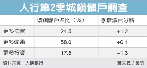 中國人民銀行昨(29)日發布今年第2季城鎮儲戶、銀行家、企業家多份問卷調查報告,其中傾向「更多儲蓄」居民占58%,季增0.1個百分點;傾向「更多消費」居民占24.5%,季增1.2個百分點;傾向「更多投資」居民占17.5%,季減1.3個百分點。顯示,大陸老百姓仍是存錢優先,消費提高情況有限