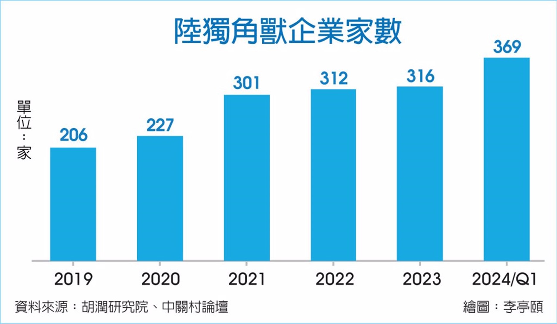 中關村論壇28日舉辦「全球獨角獸企業大會」公布的「中國獨角獸企業發展報告(2024年)」指出,截至今年3月底,大陸共有獨角獸企業369家,超過全球獨角獸企業家數的四分之一,近一年多來新晉成為獨角獸的企業67家。報告指出,369家獨角獸企業分布在16個領域,人工智慧和半導體領域數量領先。分布區域來看,「北上深廣杭」集聚超六成,北京以114家的數量位居全大陸首位。